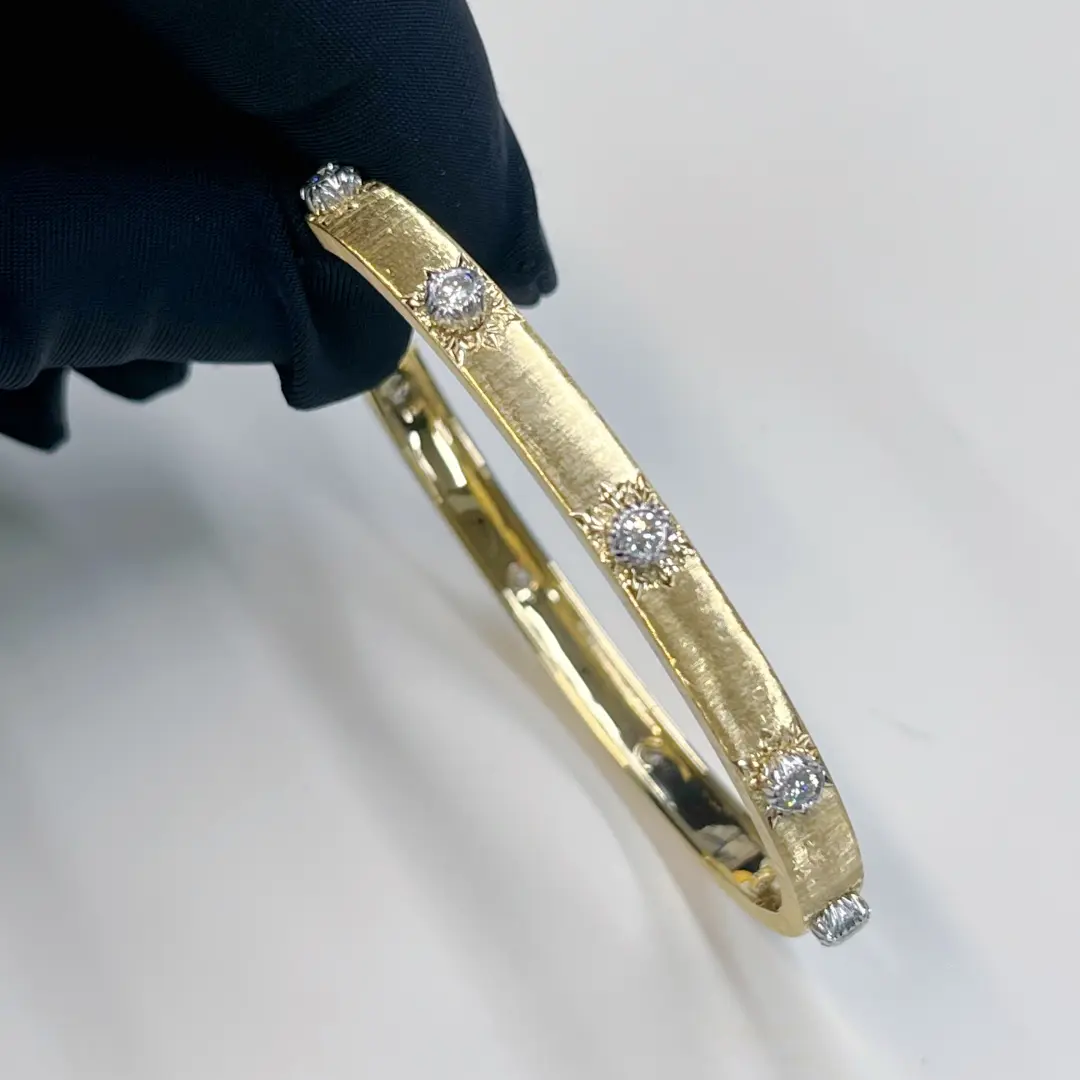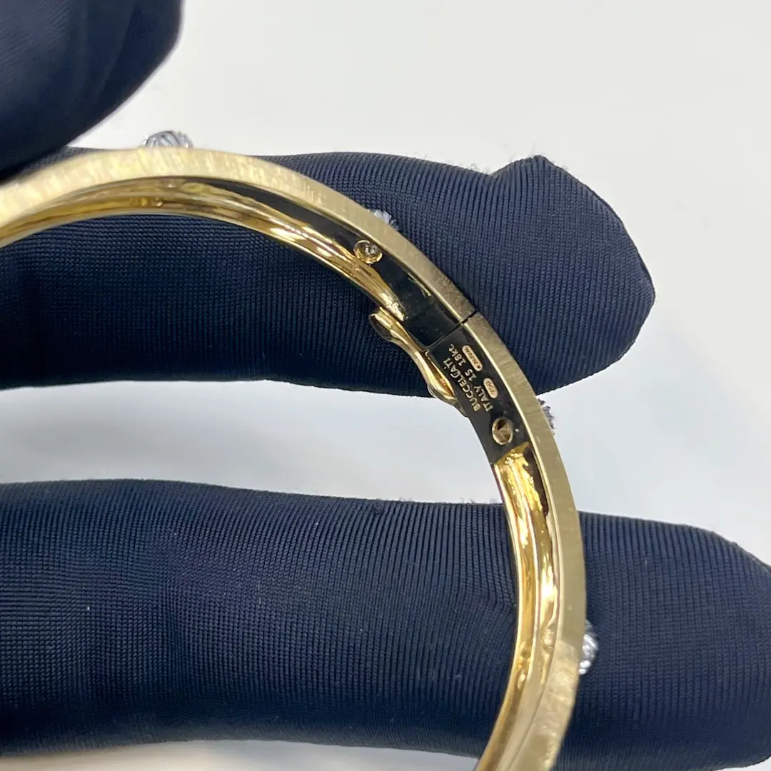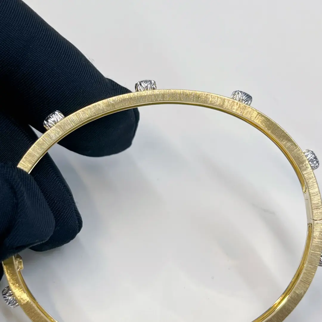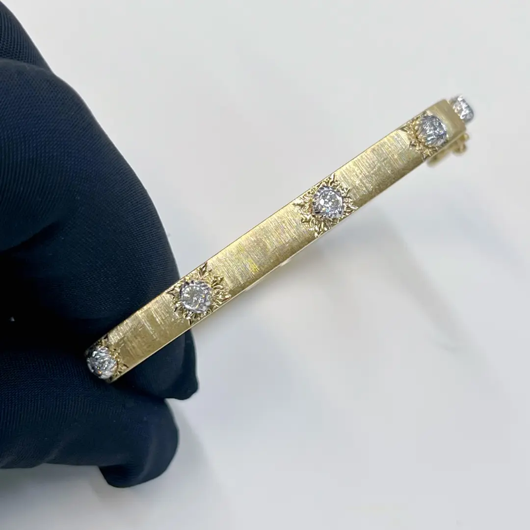 The 18k yellow and white gold Buccellati classic marci bangle bracelet with dimaonds 5mm, Inspired by the timeless elegance of Buccellati, the Macri Classica Bangle Bracelet reflects the maison’s rich goldsmithing heritage and dedication to fine craftsmanship. Originally envisioned by Gianmaria Buccellati and inspired by his daughter Maria Cristina, this iconic design showcases the brand’s signature hand-engraving technique, creating a soft, silk-like texture that enhances the brilliance of each detail. Crafted in 18K yellow and white gold, this refined bangle measures 5 mm in width and is set with 10 round diamonds totaling approximately 0.50 carats, offering a subtle yet sophisticated sparkle. With a gold weight of approximately 17.96 grams in yellow gold and 2.50 grams in white gold, it delivers both substance and luxury. Handmade in Milan, Italy, and signed by Buccellati, this bracelet is available in sizes 15, 16, and 17, making it a perfect choice for collectors and those seeking a high-end, artisanal diamond bangle that blends heritage, elegance, and everyday wearability.