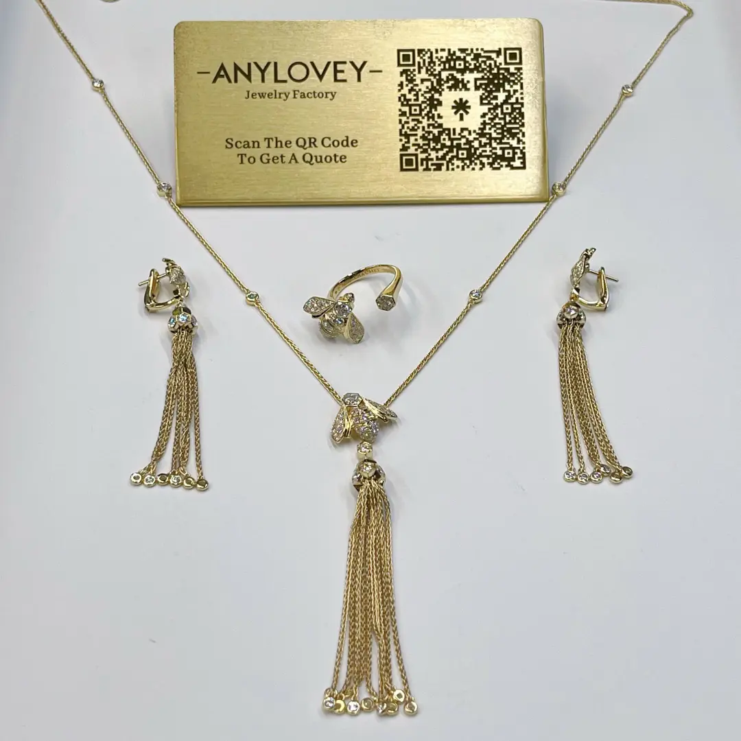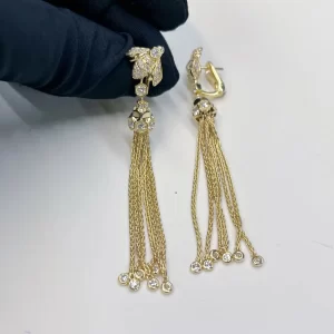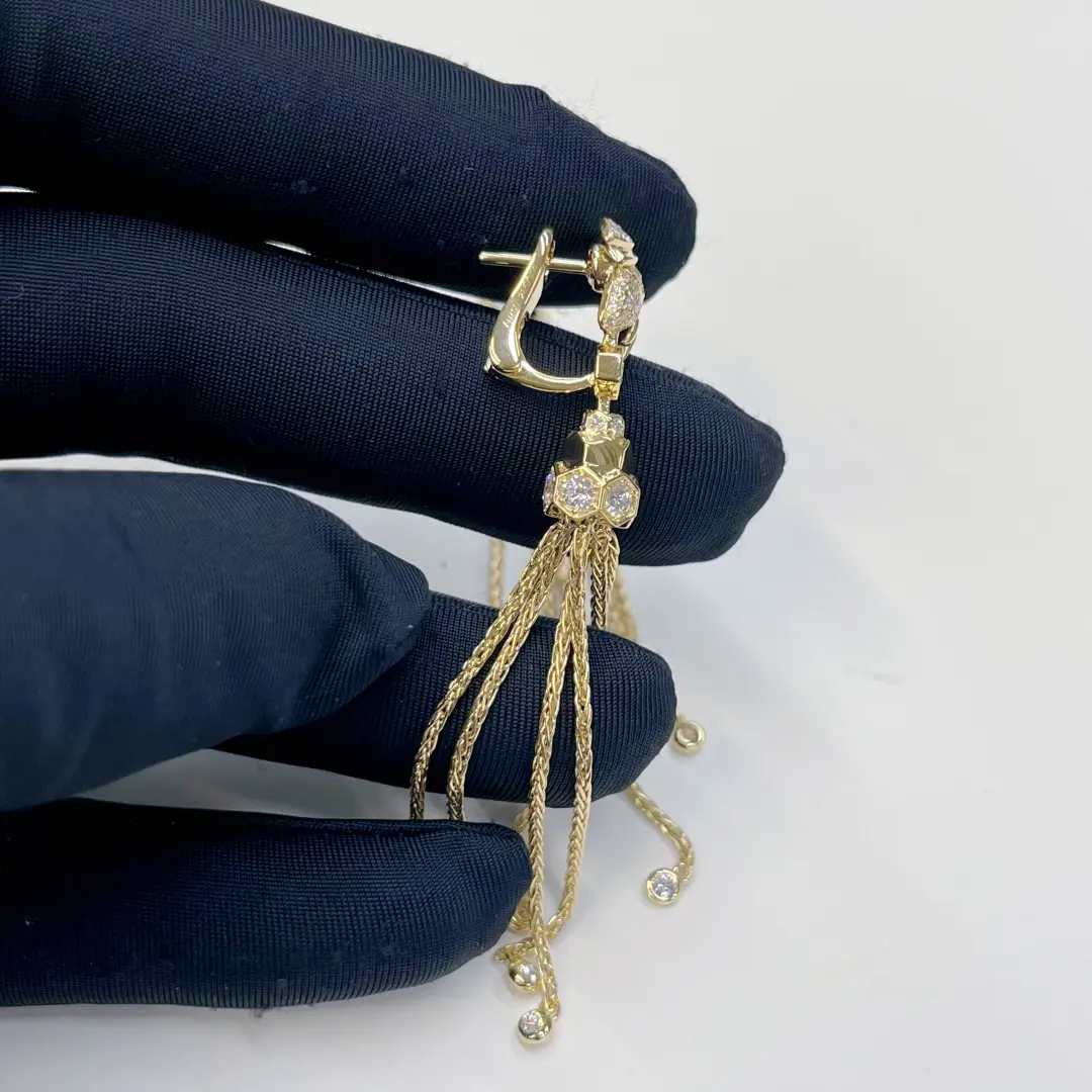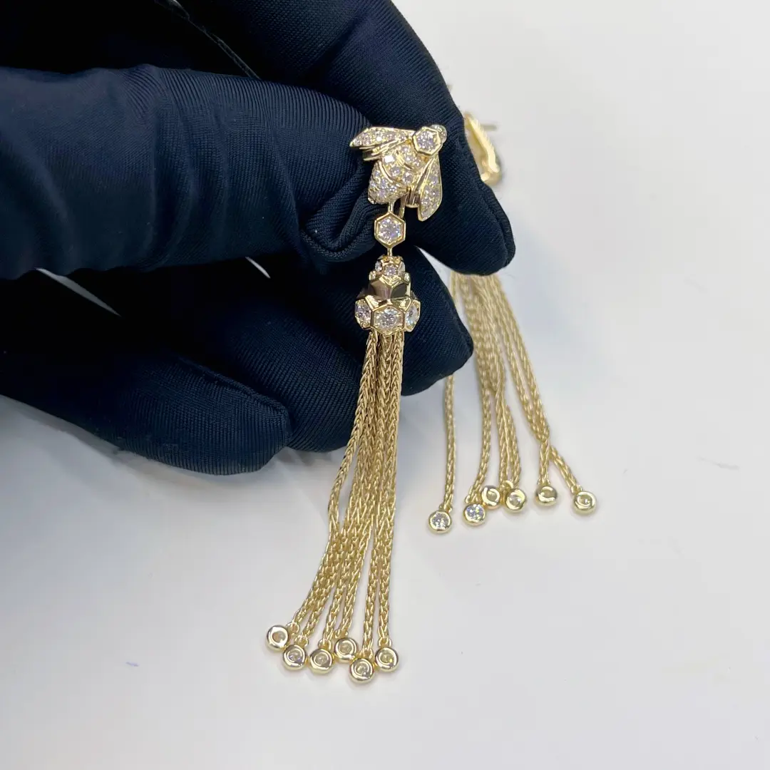 1. Anylovey jewelry factory offer all kinds of 14K 18K solid gold designer luxury jewelry, this 18K Yellow Gold Bee de Chaumet Pompon Drop Earrings with Diamonds 085732 comes from Chaumet bee my love collection, made in 18k real solid gold, 2 x 55 brilliant-cut VS+ diamonds for 1.87 carats, 1.87cttw in the whole Chaumet pompon drop earrings, 57mm length for this chaumet bee my love pompon drop earrings, lab diamonds also available as an alternative option, match with Chaumet earrings jewelry box and paper, handbag package with best quality and great price, buy this Real gold Chaumet Pompon Drop Earrings with Hexagonal Diamond 085732,  color available in yellow gold only, weight over 20 grams, 110pcs diamonds in the necklace, including hexagonal cut diamond and round shape diamonds. 57mm length, 9k gold and 14k gold can be customized at the same time.