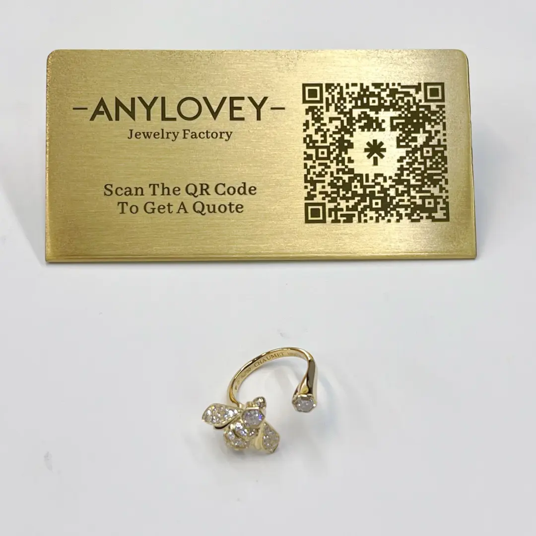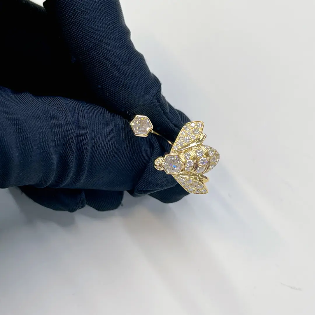 1. Anylovey jewelry factory offer all kinds of 14K 18K solid gold designer luxury jewelry, this 18K Yellow Gold Bee de Chaumet Ring with 2 Pieces Hexagonal Cutting Diamonds 085065 comes from Chaumet bee my love collection, made in 18k real solid gold, 43 brilliant-cut VS+ diamonds totalling 0.53 carat, 1 Chaumet exclusive 88-facet hexagonal empress cut VS+ diamond, approx. 0.25 carat, 1 Chaumet exclusive 88-facet hexagonal cut G VS+ diamond, weighing between 0.30 and 0.39 carat, about 1.17cttw in the whole Chaumet bee my love between finger ring, lab diamonds also available as an alternative option, match with Chaumet ring jewelry box and paper, handbag package with best quality and great price, buy this Real gold Chaumet Between Finger Ring with 2 Pieces Hexagonal Diamond 085516,  color available in yellow gold only, weight over 7.5 grams, 45pcs diamonds in the necklace, including hexagonal cut diamond and round shape diamonds. any ring size available from anylovey jewelry, 9k gold and 14k gold can be customized at the same time.